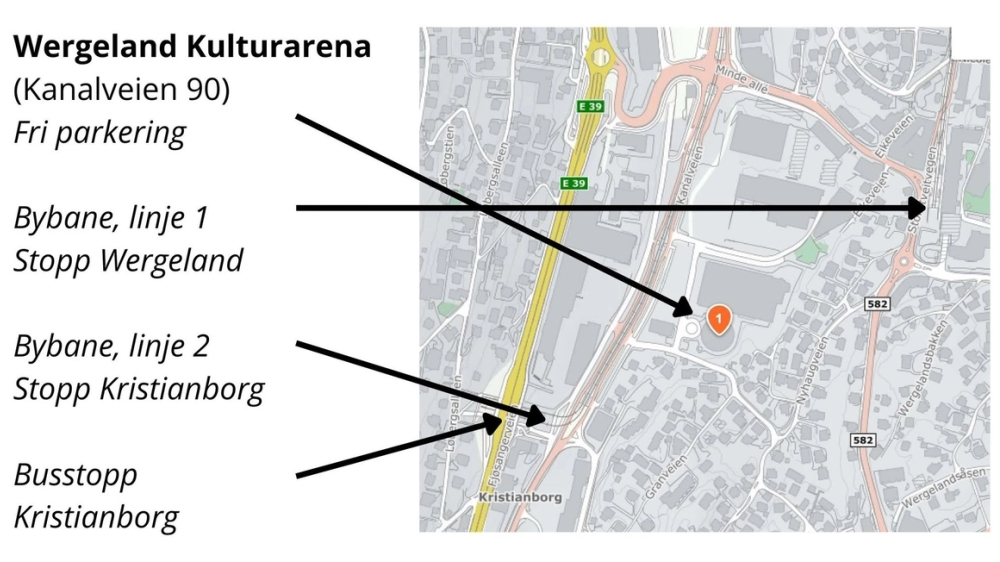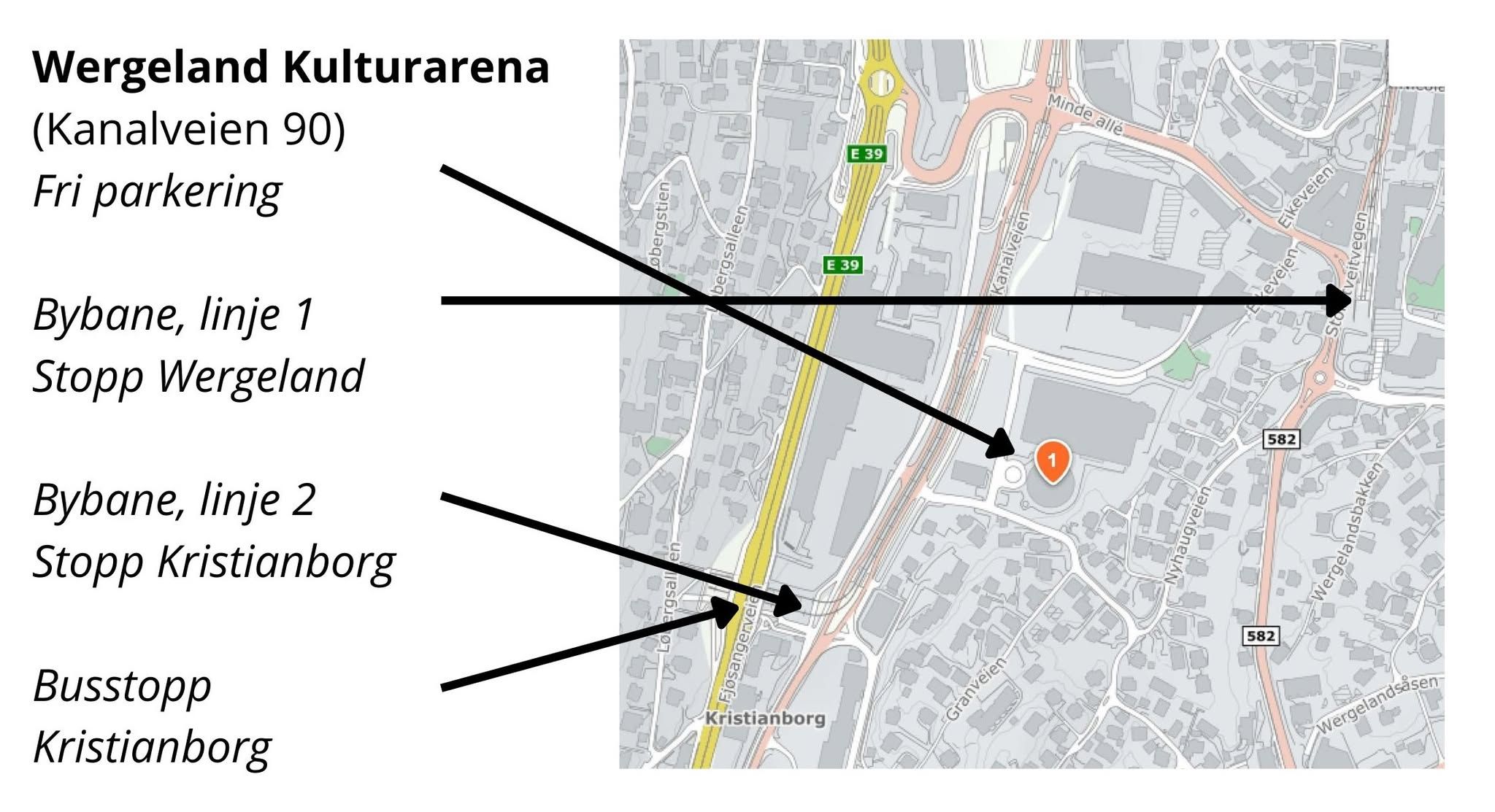 Du kommer deg dit med Bybanen linje 1 til Wergeland, eller linje 2 til Kristianborg. Fri parkering på området
