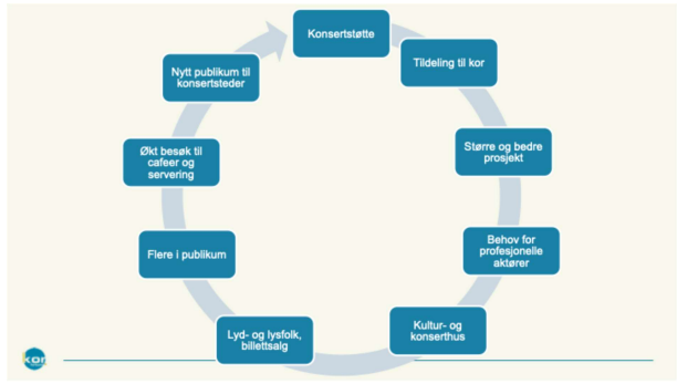 Dette vil være en ordning som kommer hele korfeltet til gode, uavhengig av organisasjonstilknytning. Og vil være en konkret støtte som vil initiere store ringvirkninger. Effekten av konsertstøtten kan vi gjerne oppsummere i et kretsløp som dette: